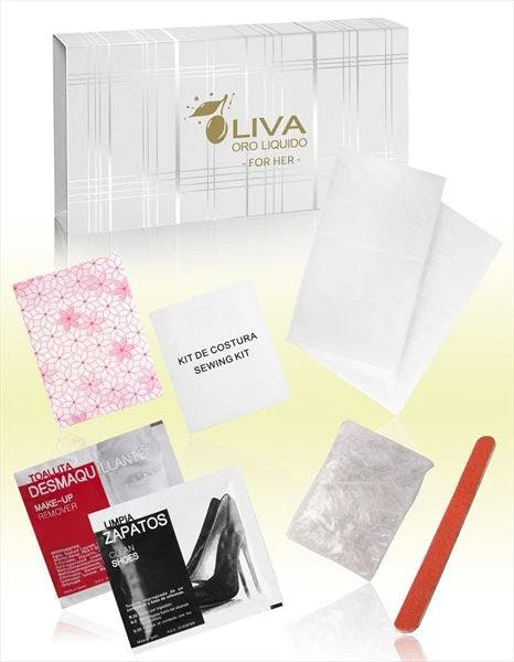 For Her BVG Gold, besteht aus Nähset, Taschentücher, Abschmincktuch, Schuhtuch, Duschhaube und Nagelfeile.